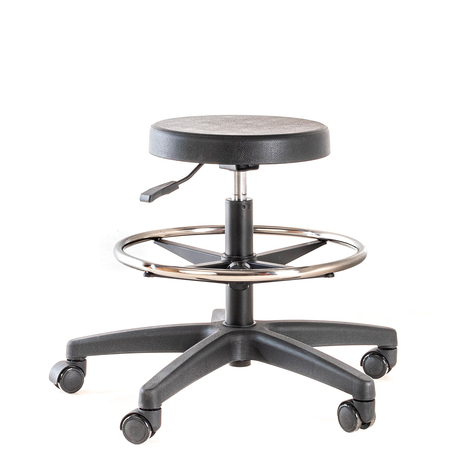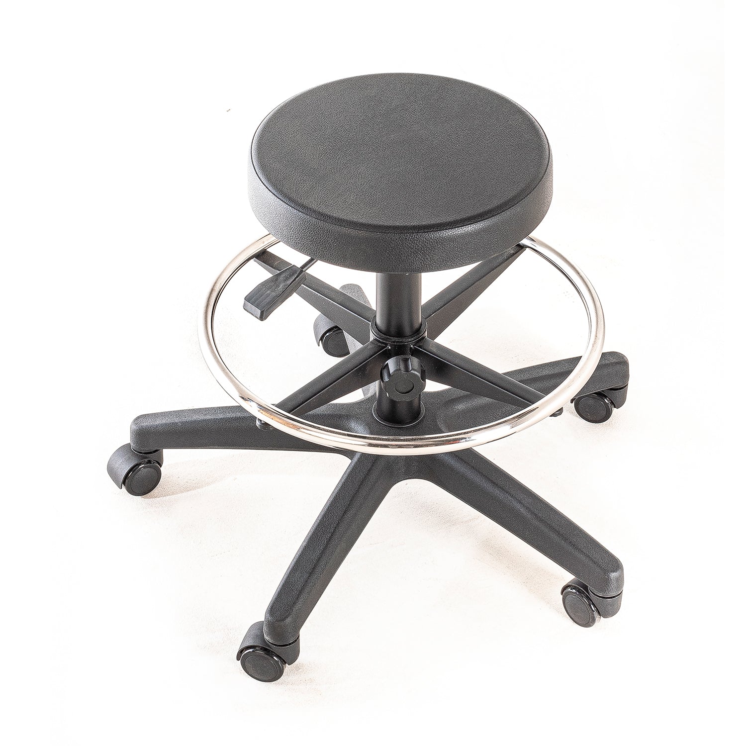 Piso o taburete de laboratorio. Asiento redondo de PU regulable en altura con cilindro neumático, aro apoya pies de acero cromado ajustable y ruedas de PU de 50 mm de diámetro.