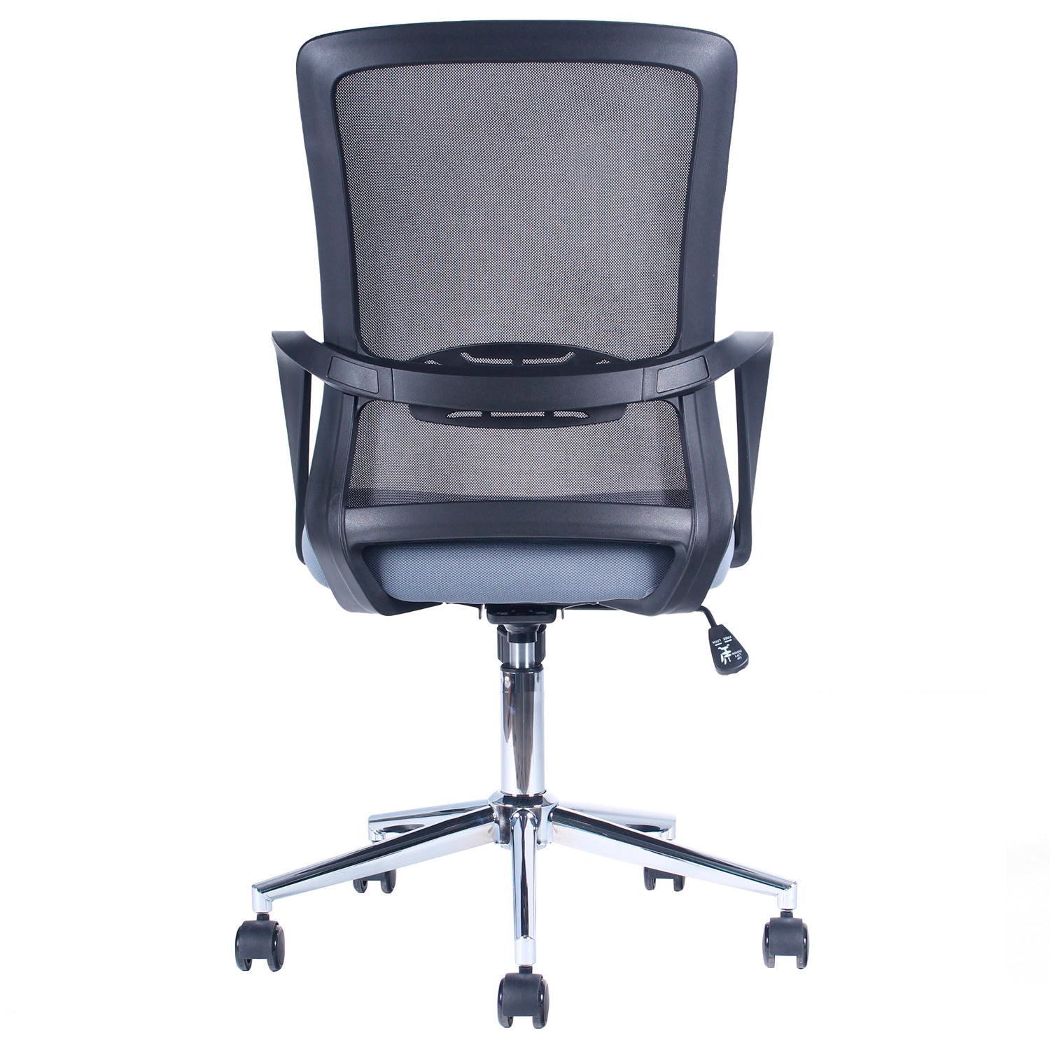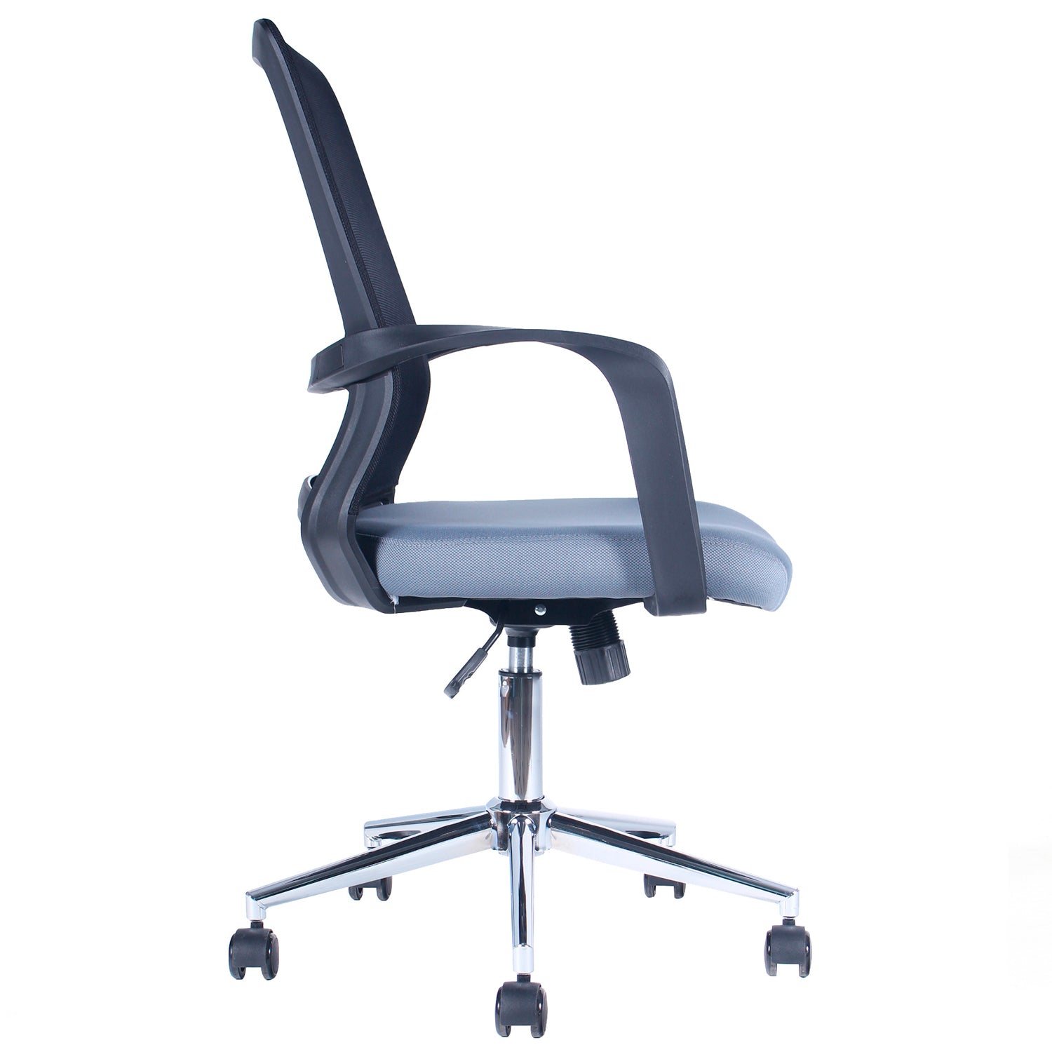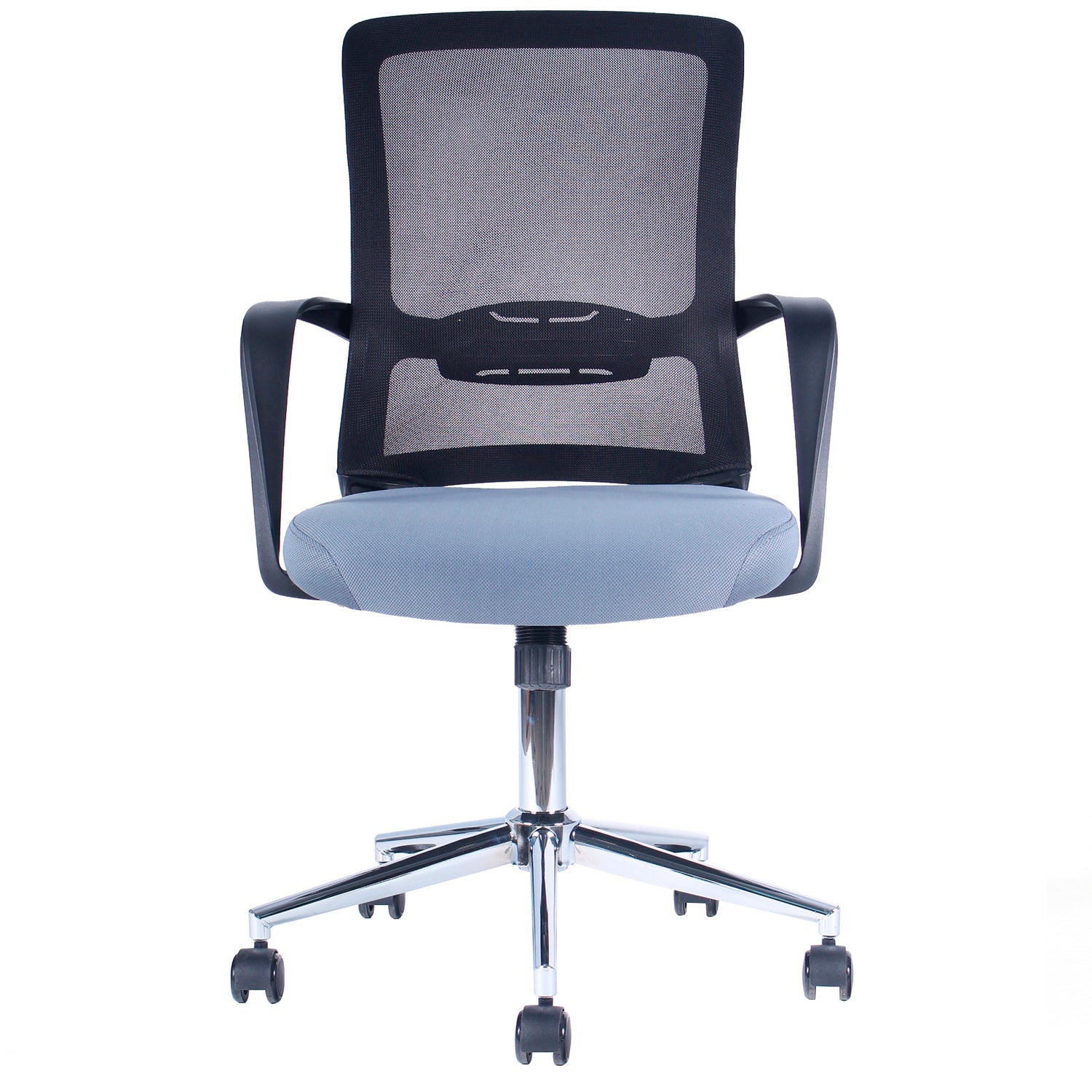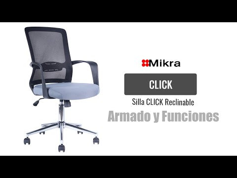 Silla modelo CLICK Reclinable. Respaldo de malla con soporte lumbar fijo. Mecanismo de reclinación simple y regulación de tensión. Apoyabrazos fijos de polipropileno. Asiento de espuma inyectada tapizado en tela azul piedra. Base de acero cromado de 620 mm con ruedas blandas de PU de 50 mm de diámetro.
