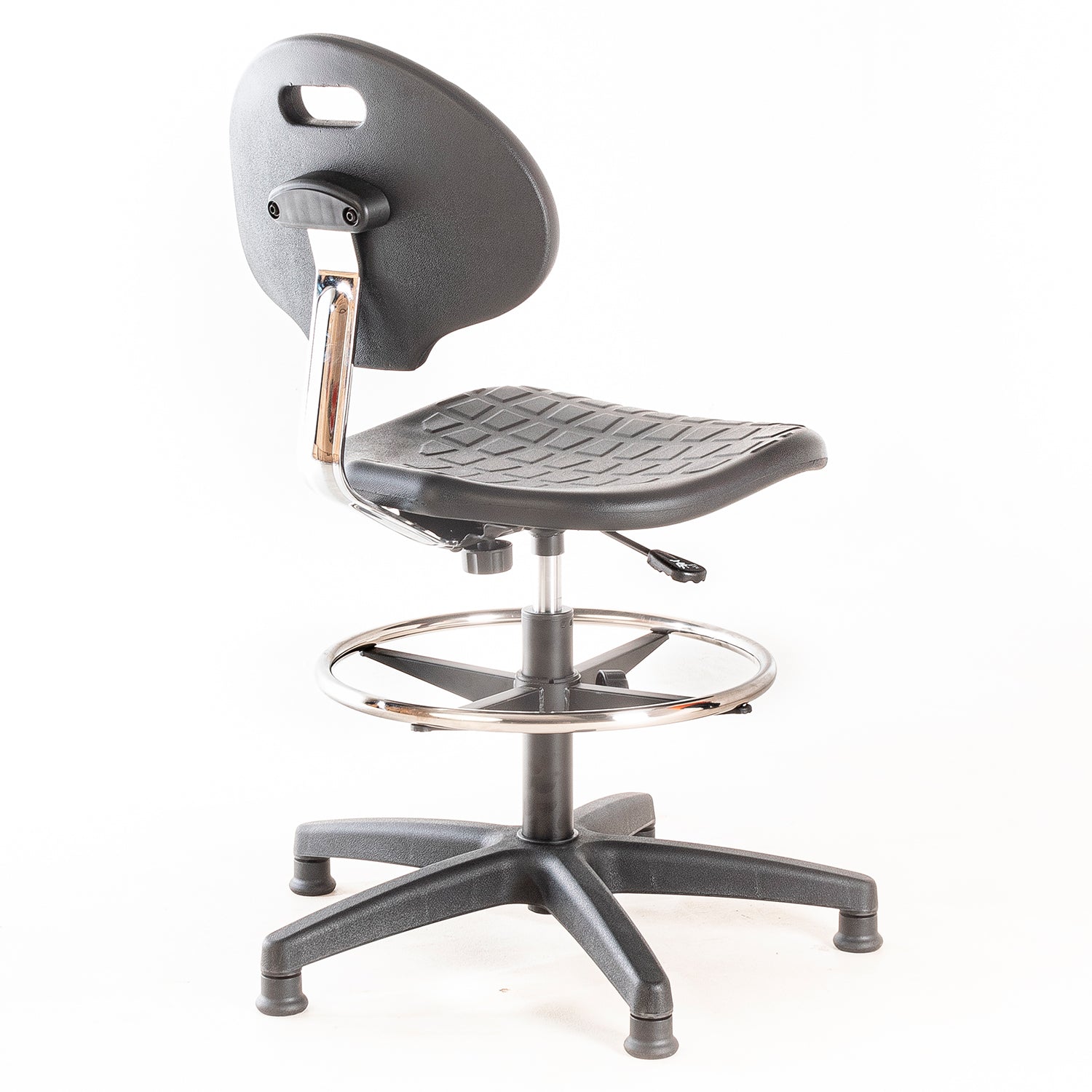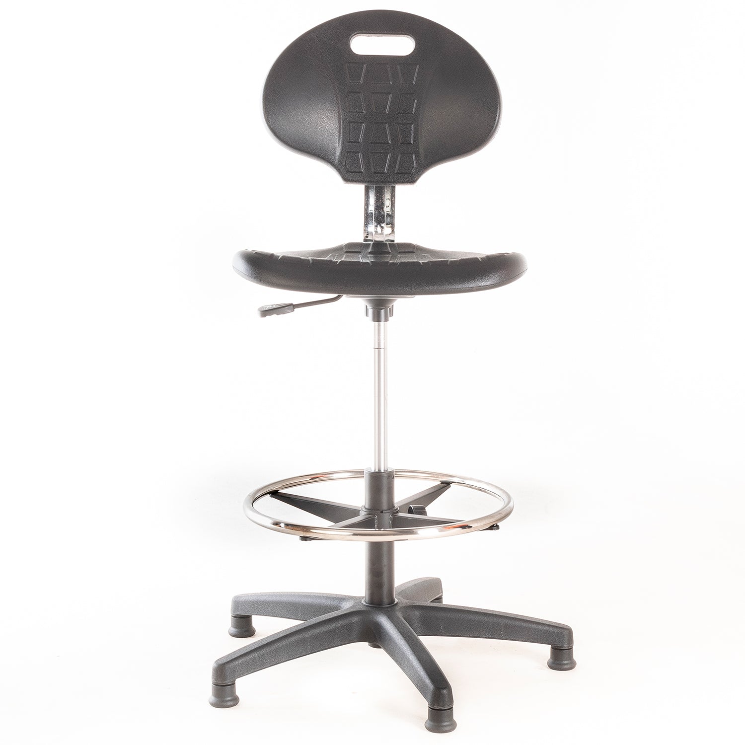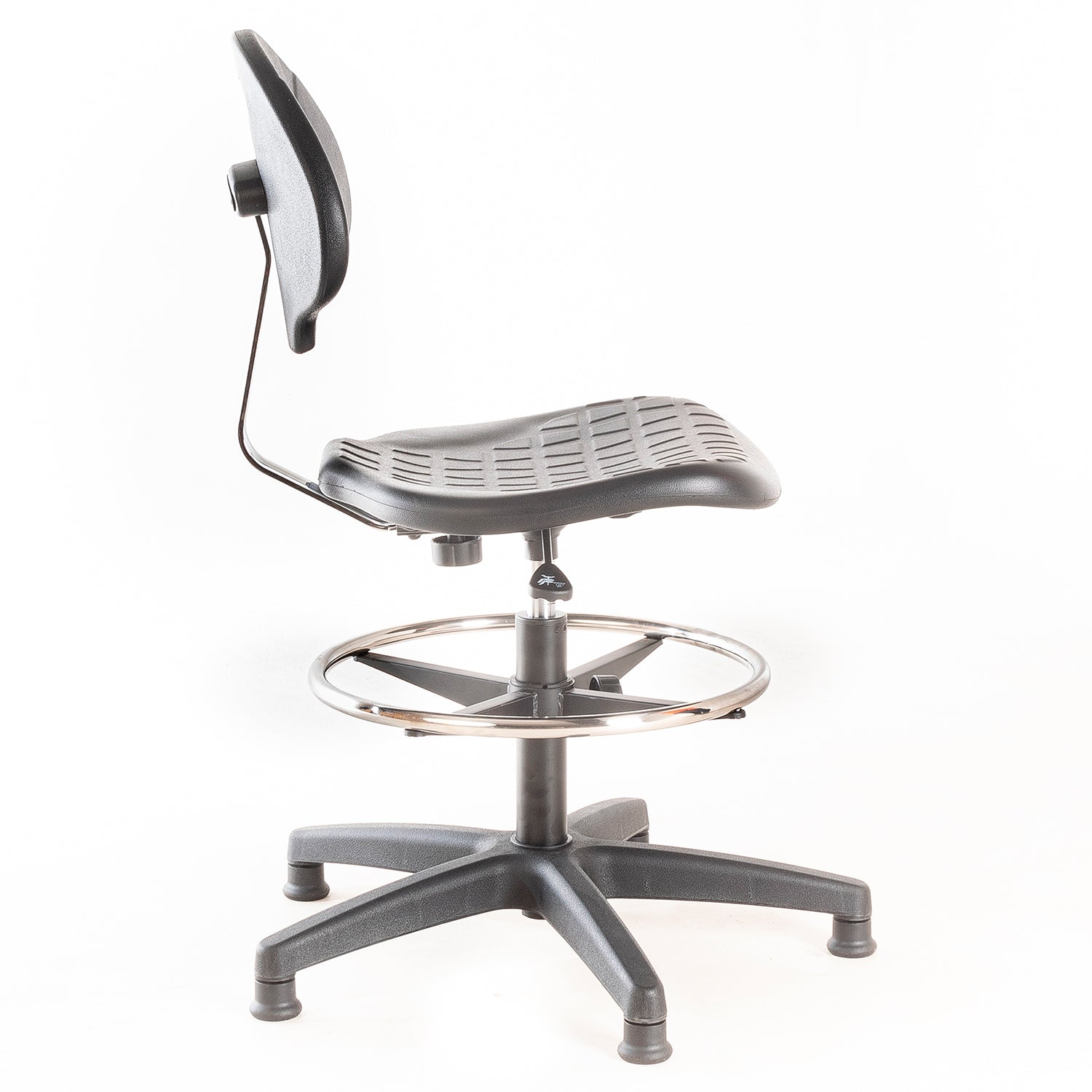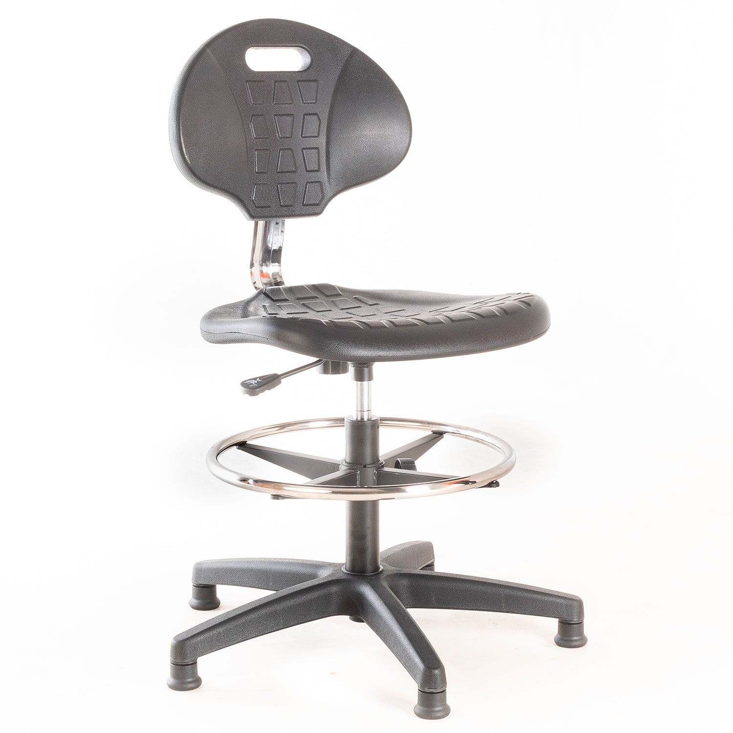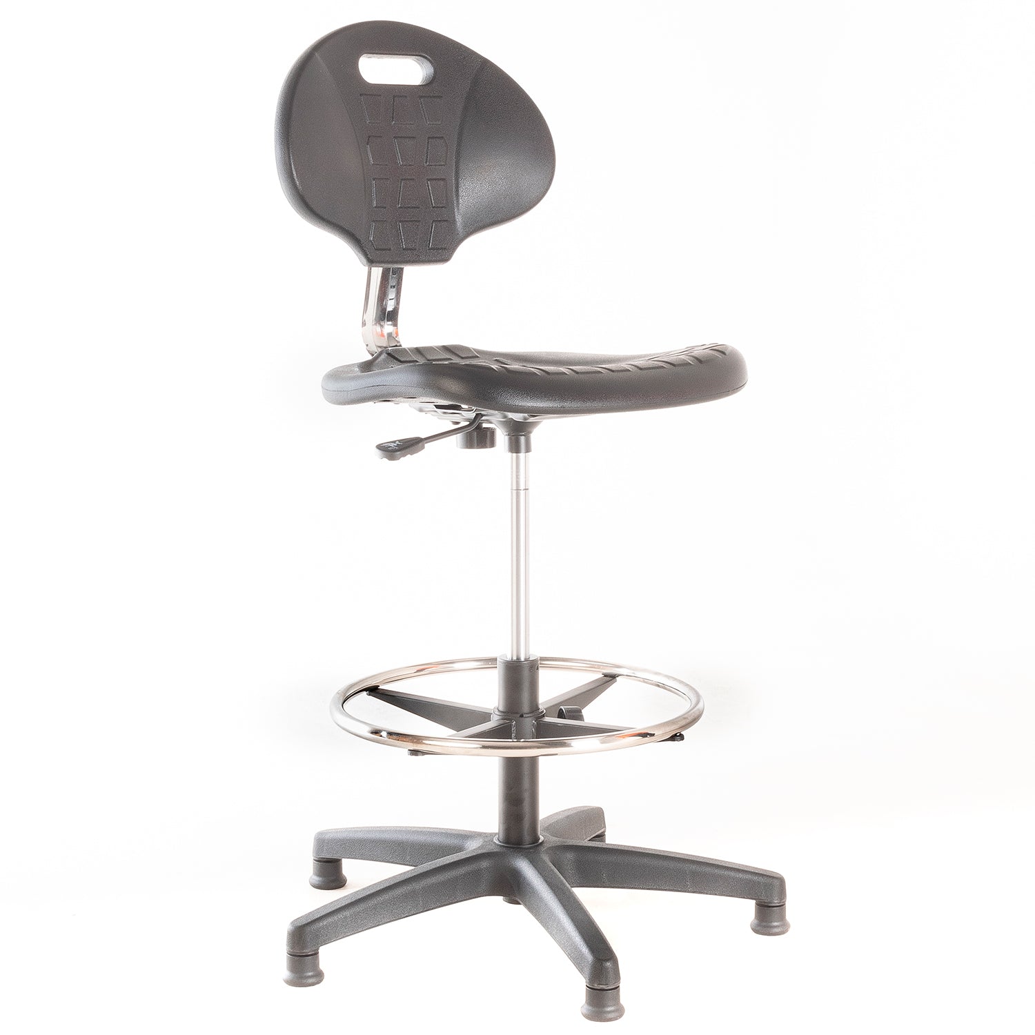 Silla de laboratorio. Asiento y respaldo de PU, regulable en altura con cilindro neumático, aro apoya pies de acero cromado ajustable en altura y patines de nylon.