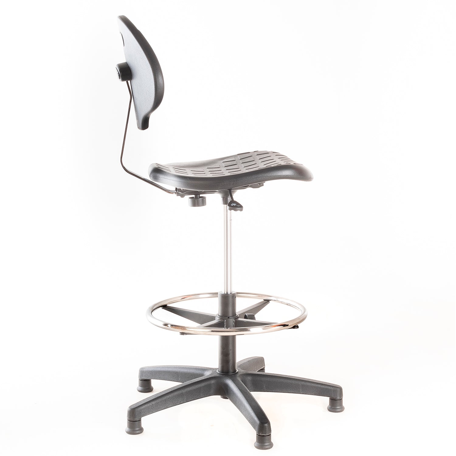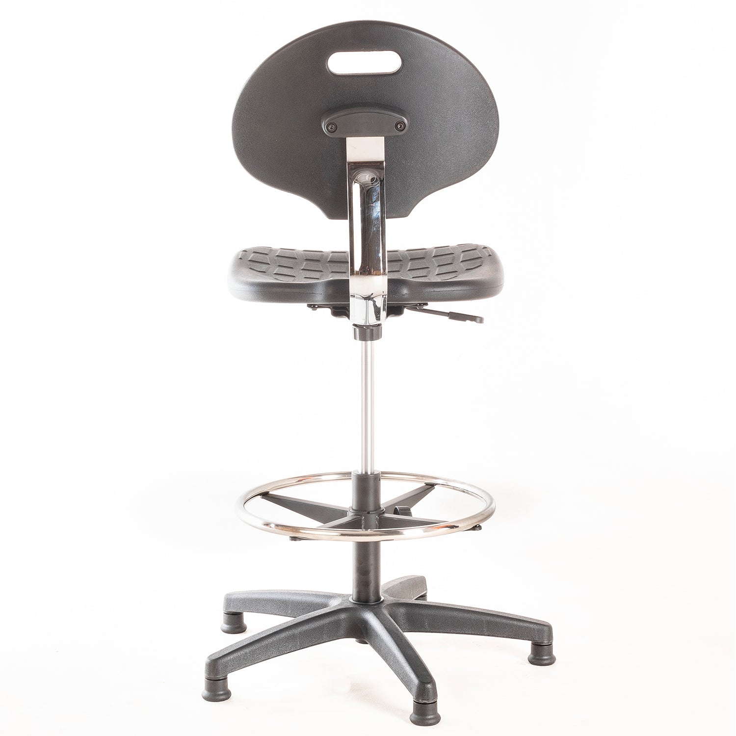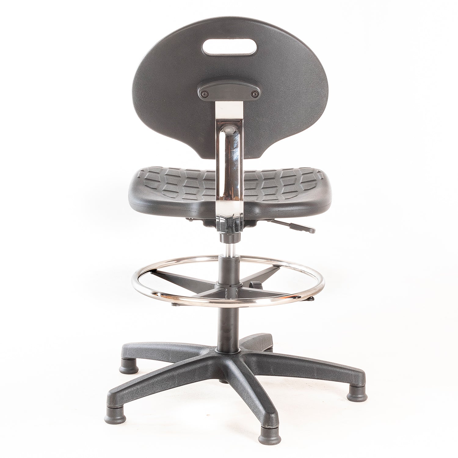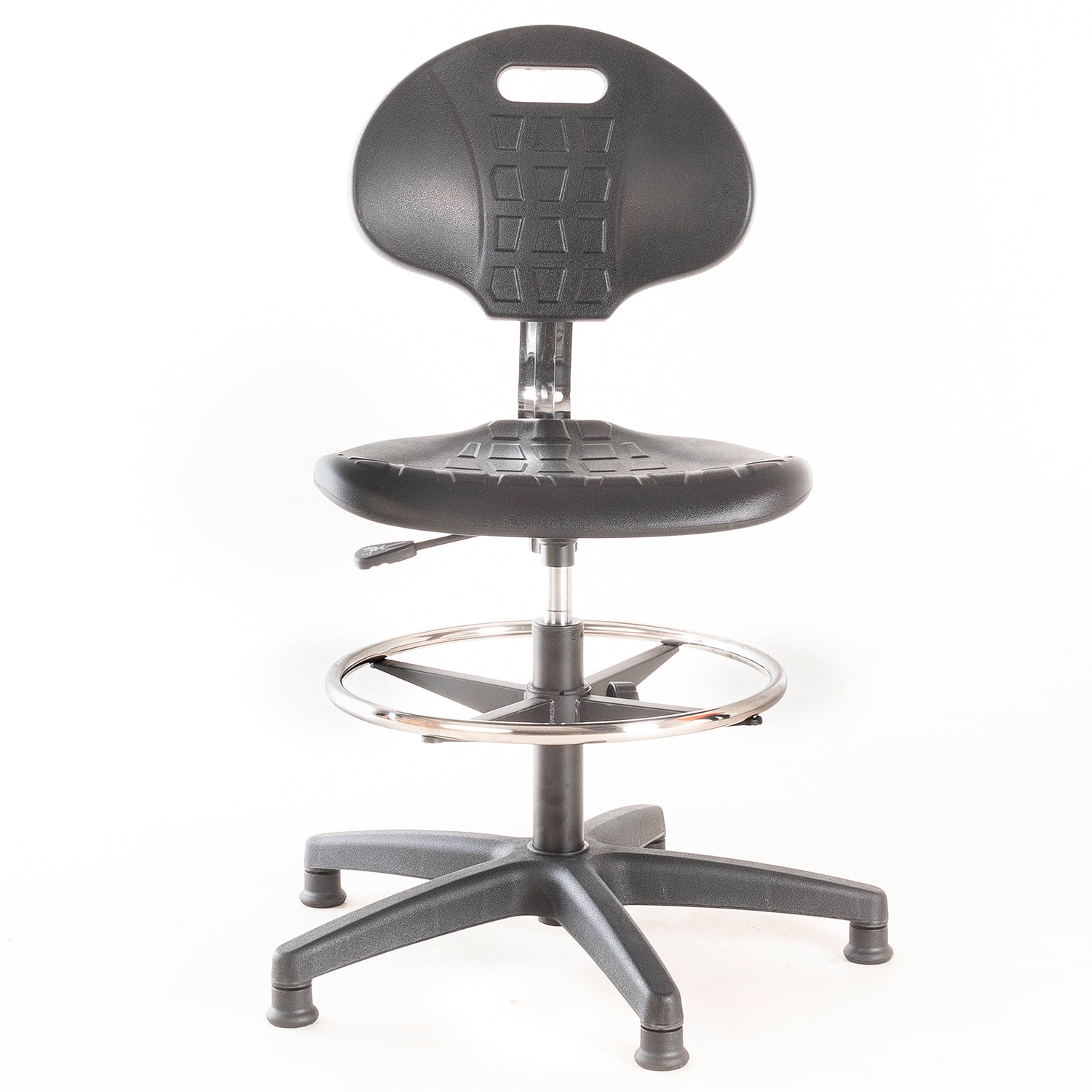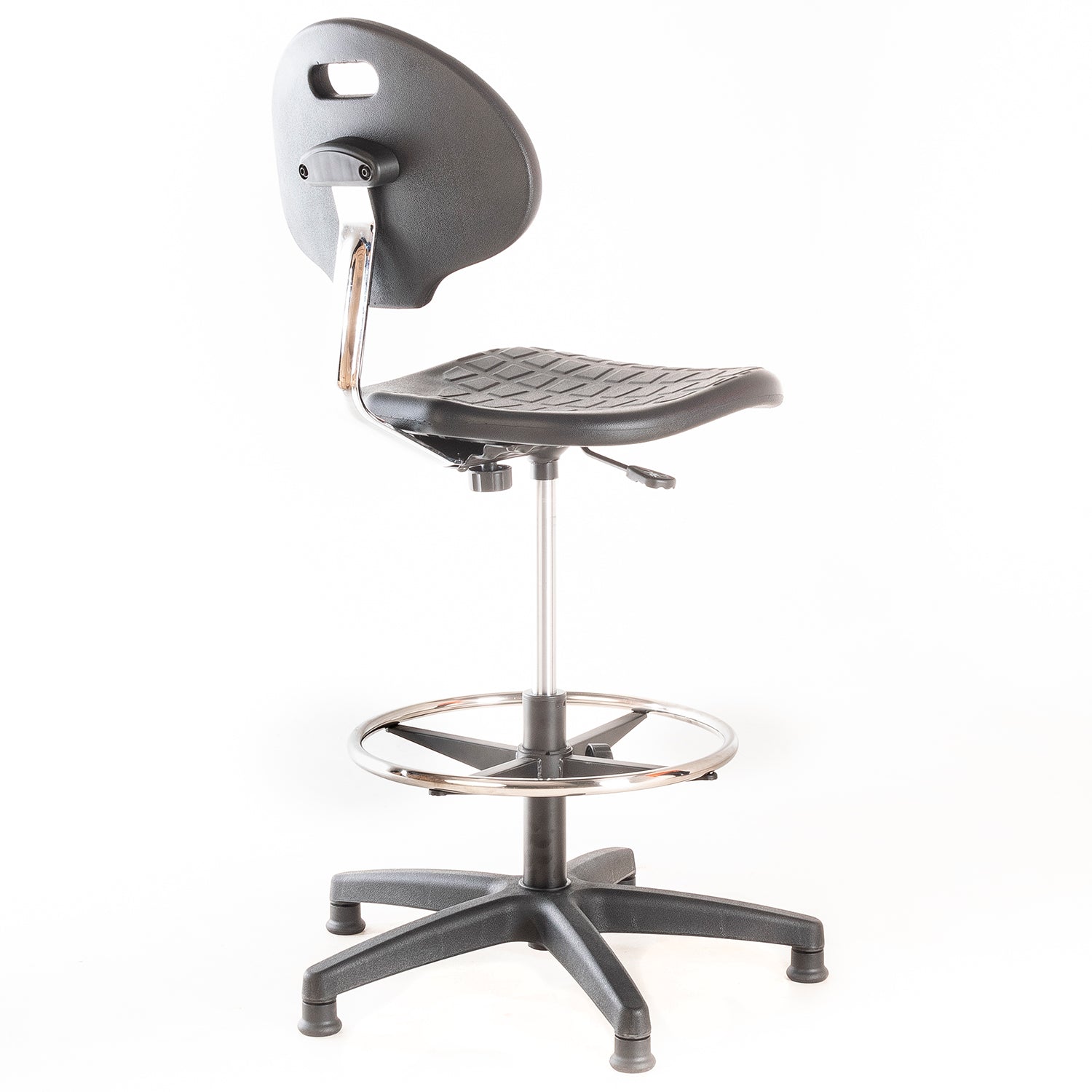 Silla de laboratorio. Asiento y respaldo de PU, regulable en altura con cilindro neumático, aro apoya pies de acero cromado ajustable en altura y patines de nylon.
