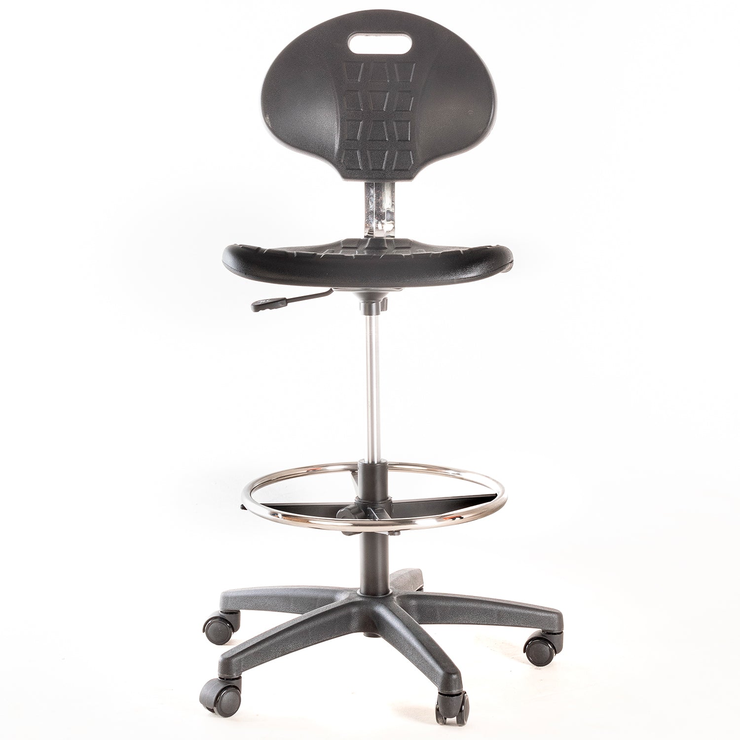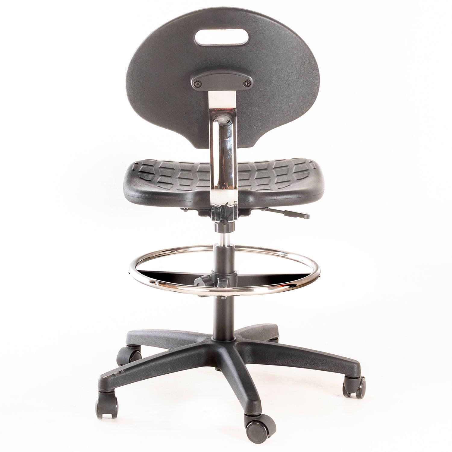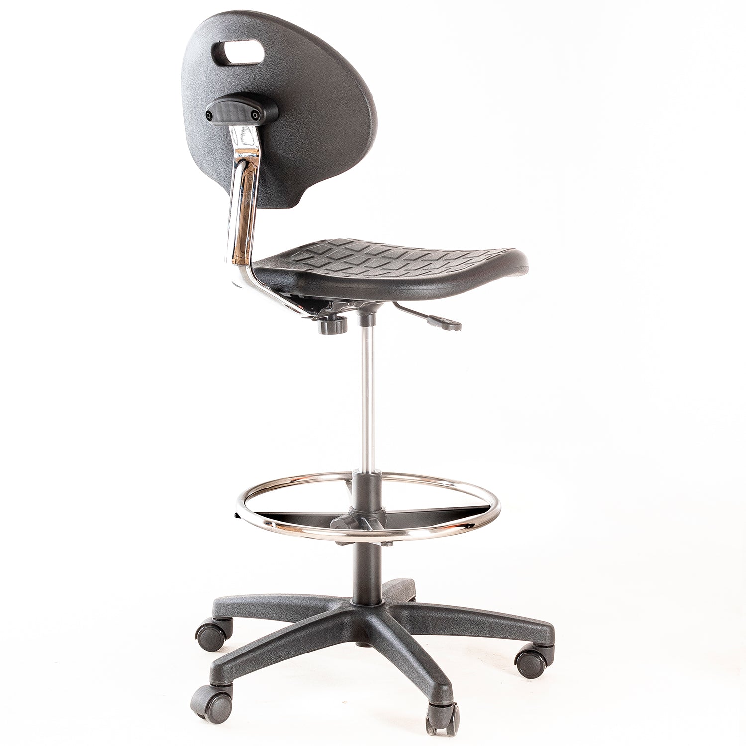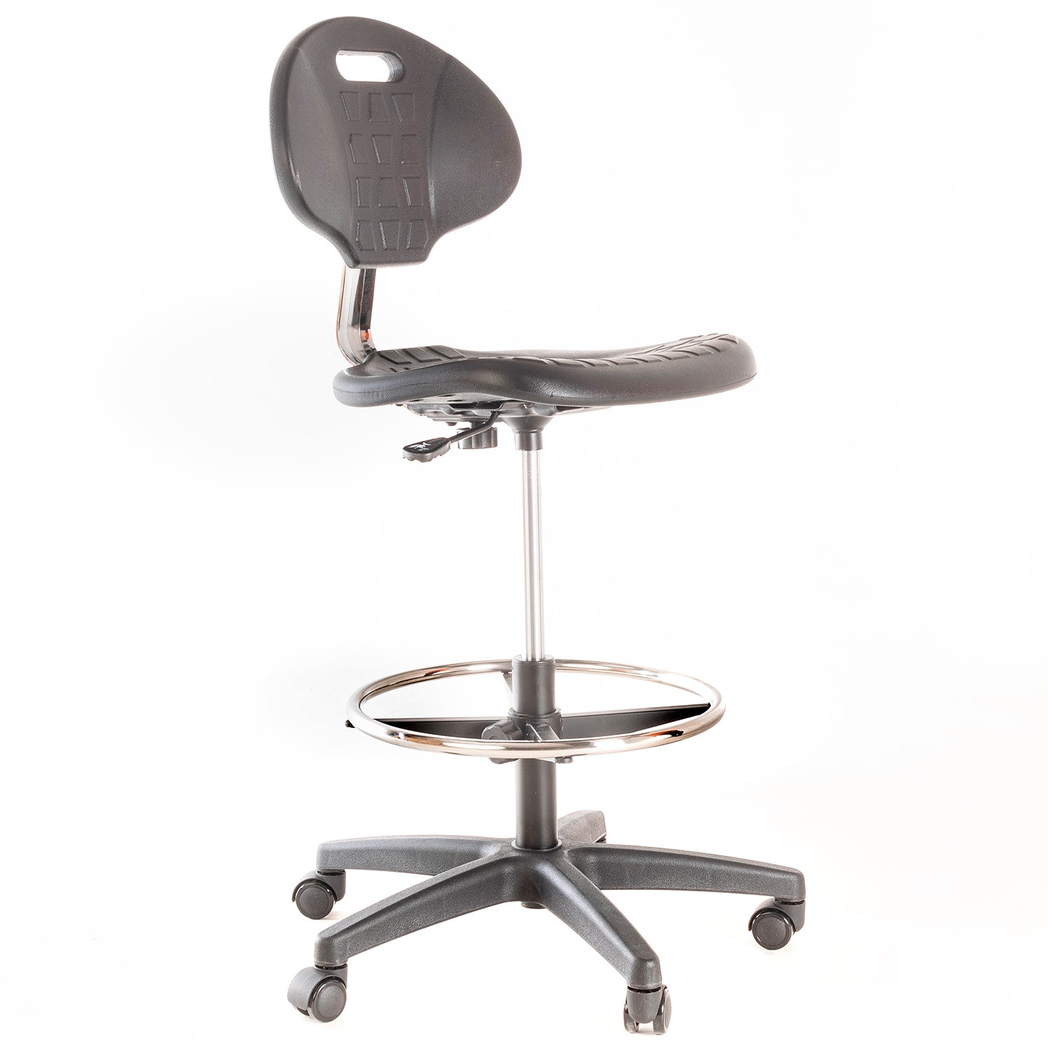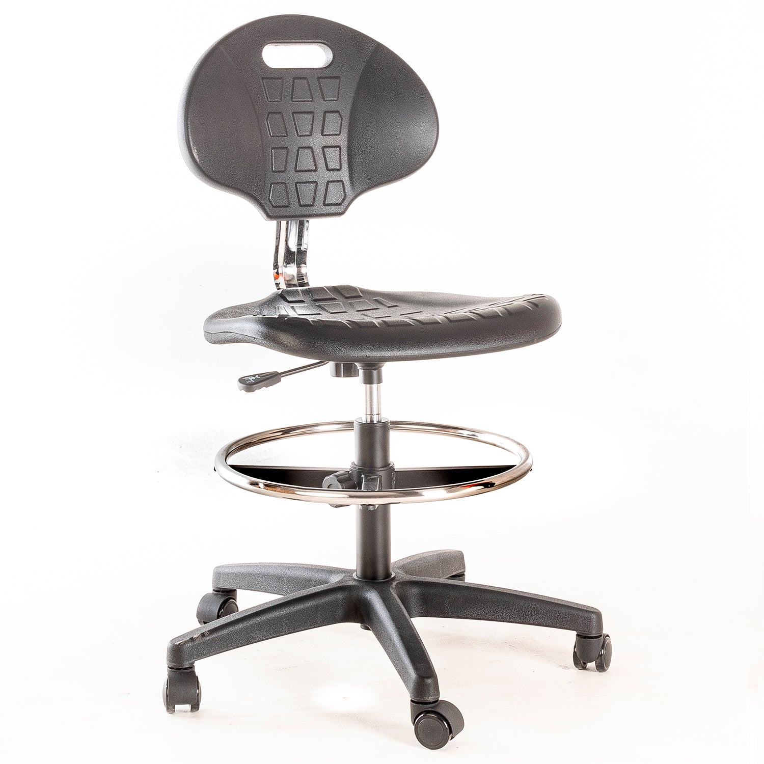 Silla de laboratorio. Asiento y respaldo de PU, regulable en altura con cilindro neumático, aro apoya pies de acero cromado ajustable en altura y ruedas de PU de 50 mm de diámetro.