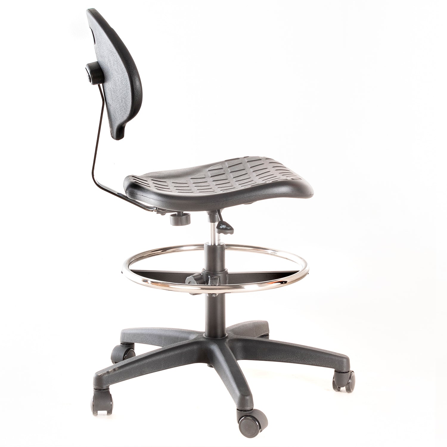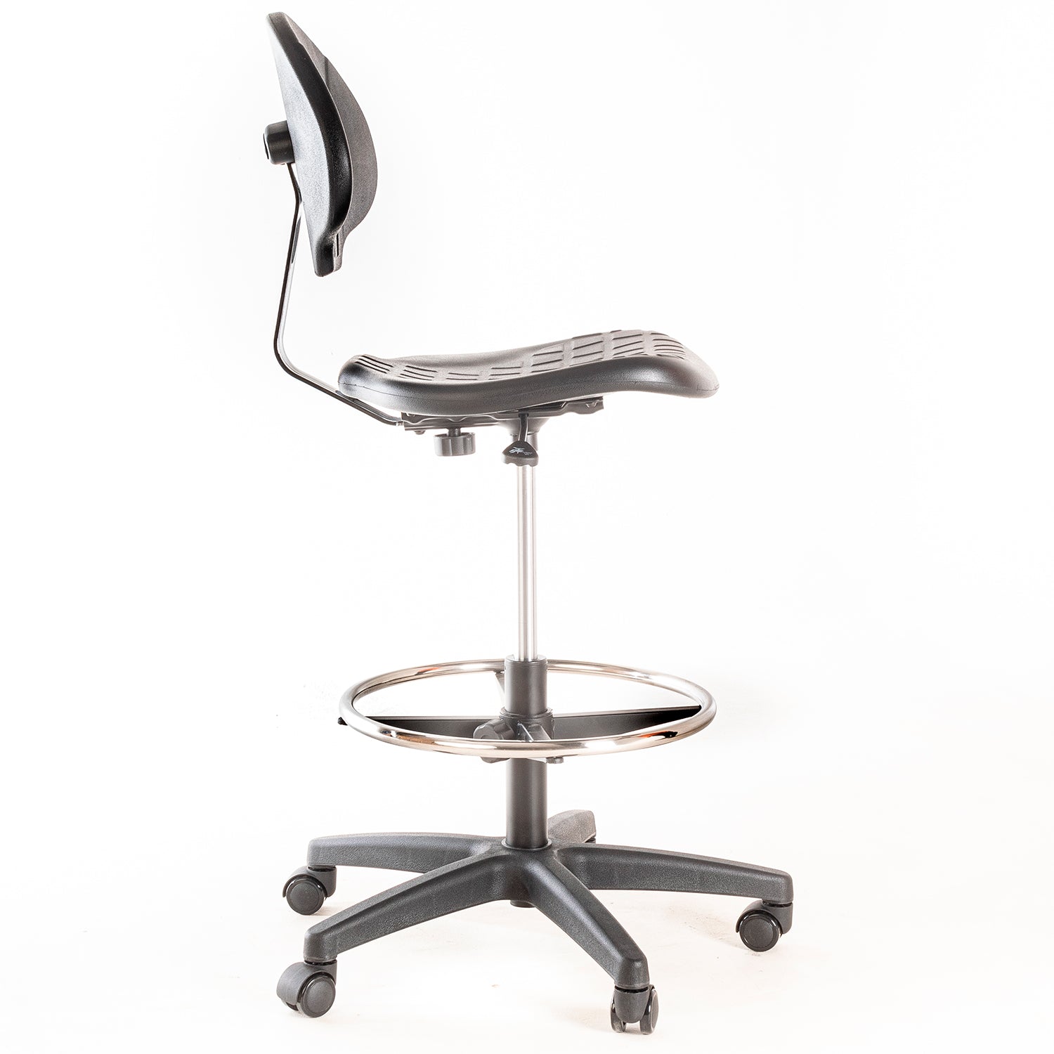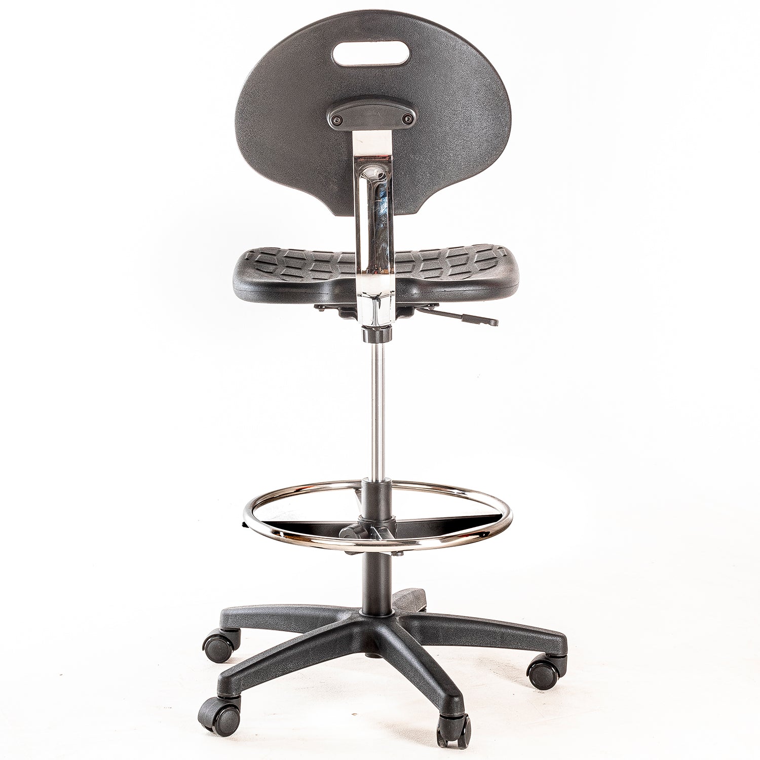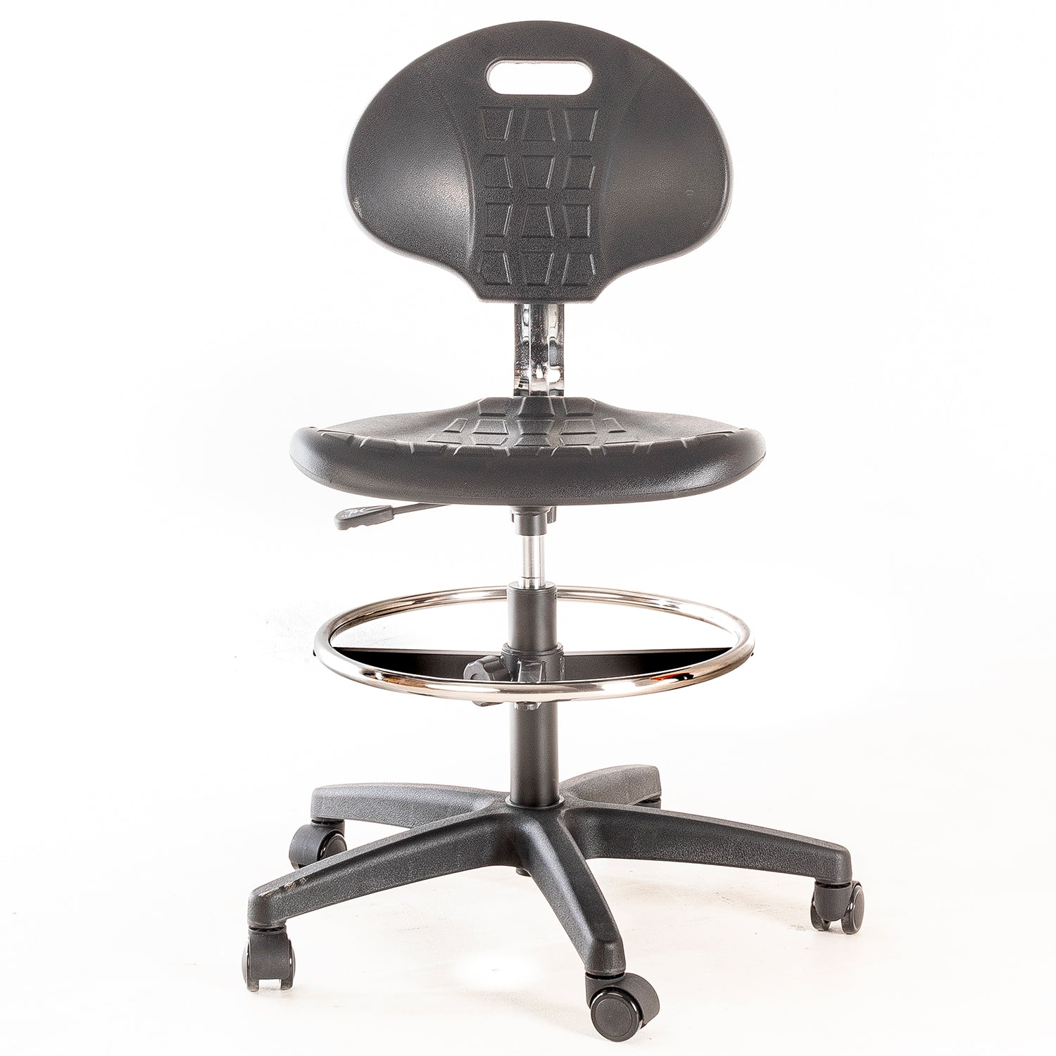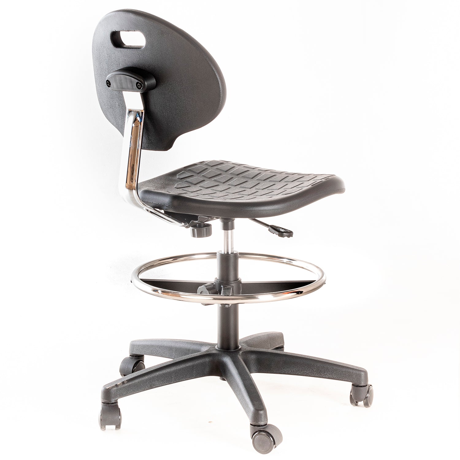 Silla de laboratorio. Asiento y respaldo de PU, regulable en altura con cilindro neumático, aro apoya pies de acero cromado ajustable en altura y ruedas de PU de 50 mm de diámetro.