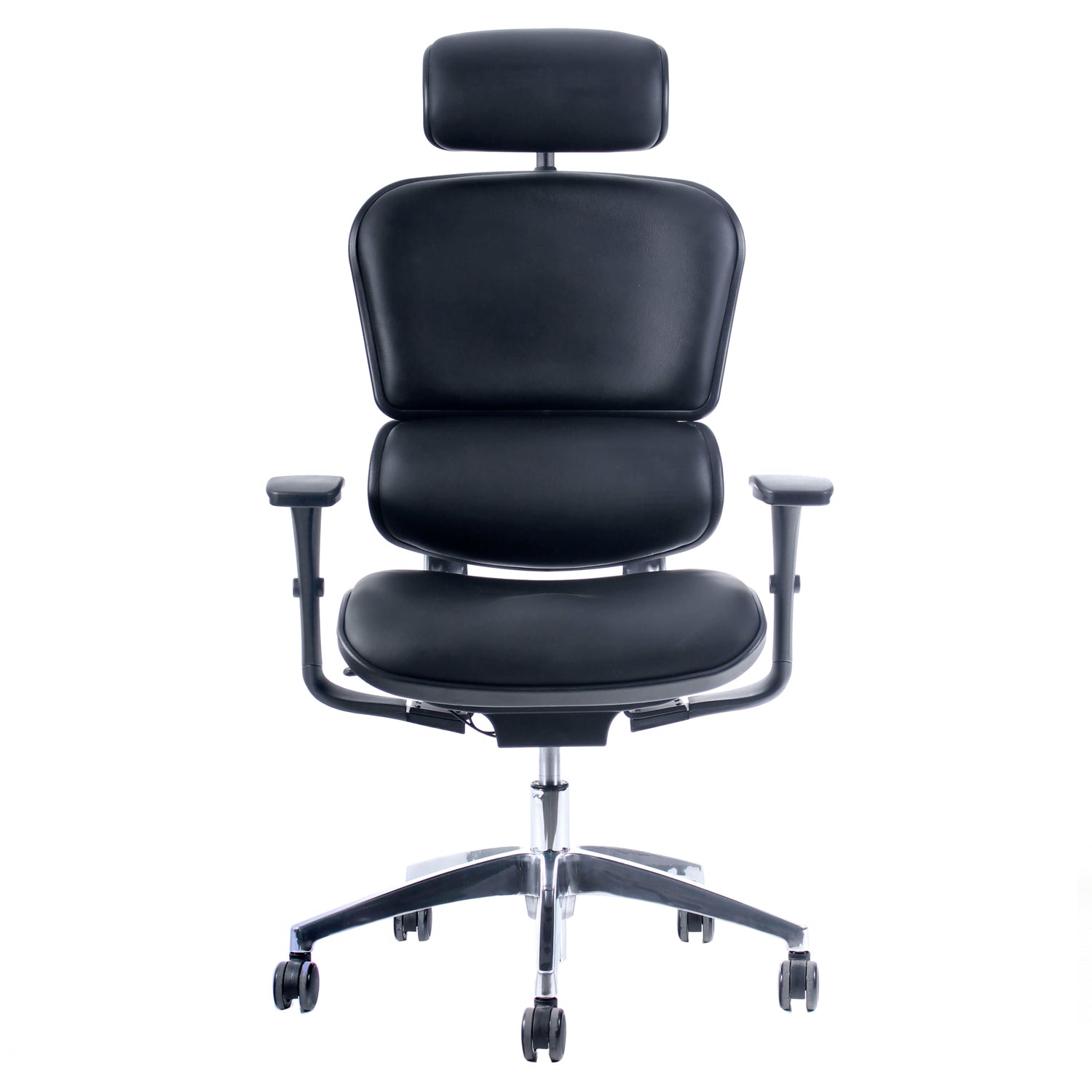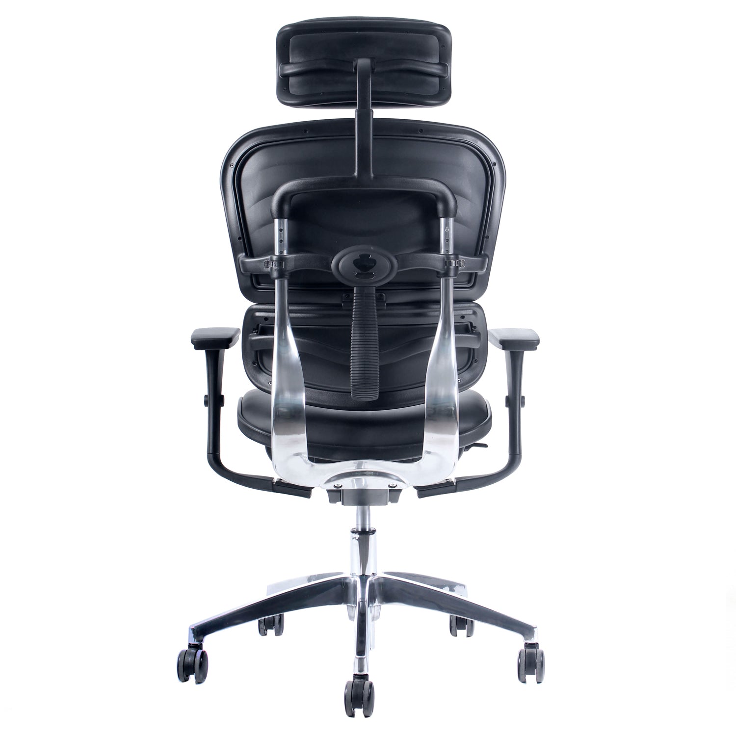Silla ergonómica, variación simplificada del modelo Ergohuman Cuero. Utiliza mecanismo sincrónico con fijación en múltiples posiciones y sistema de tensión autopesante. Asiento de cuero con deslizador, para regulación de la profundidad. Respaldo de cuero, regulable en altura y con soporte lumbar dinámico. Apoya cabeza de cuero, regulable en altura y ángulo. Apoyabrazos regulables en altura, ángulo y profundidad, con almohadillas blandas de PU. Base de aluminio inyectado de 680 mm de diámetro con pistón de 120 mm y ruedas blandas de PU de 60 mm de diámetro.