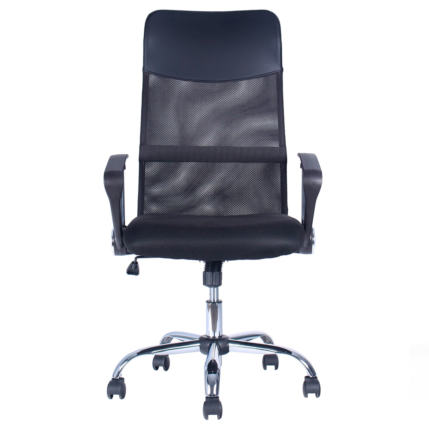 Silla con respaldo alto y cabecero. Incluye mecanismo de reclinación simple y sistema de tensión regulable. Respaldo de malla con refuerzo lumbar fijo y apoyabrazos fijos de acero cromado con apoyos de PP.
